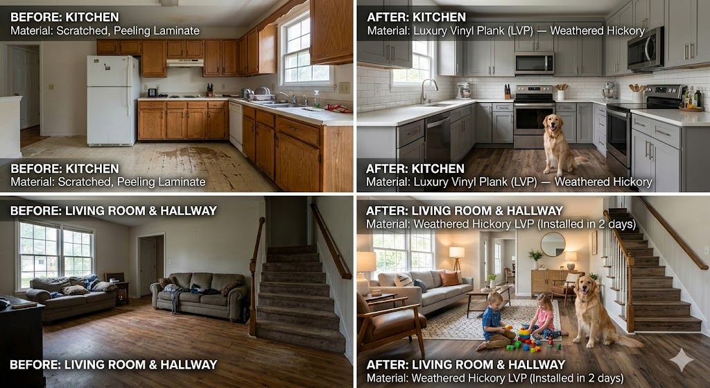 We recommended a premium waterproof LVP with a thick wear layer and realistic wood-grain texture. The result? Floors that look like genuine hickory hardwood but laugh off spills, scratches, and muddy paws.