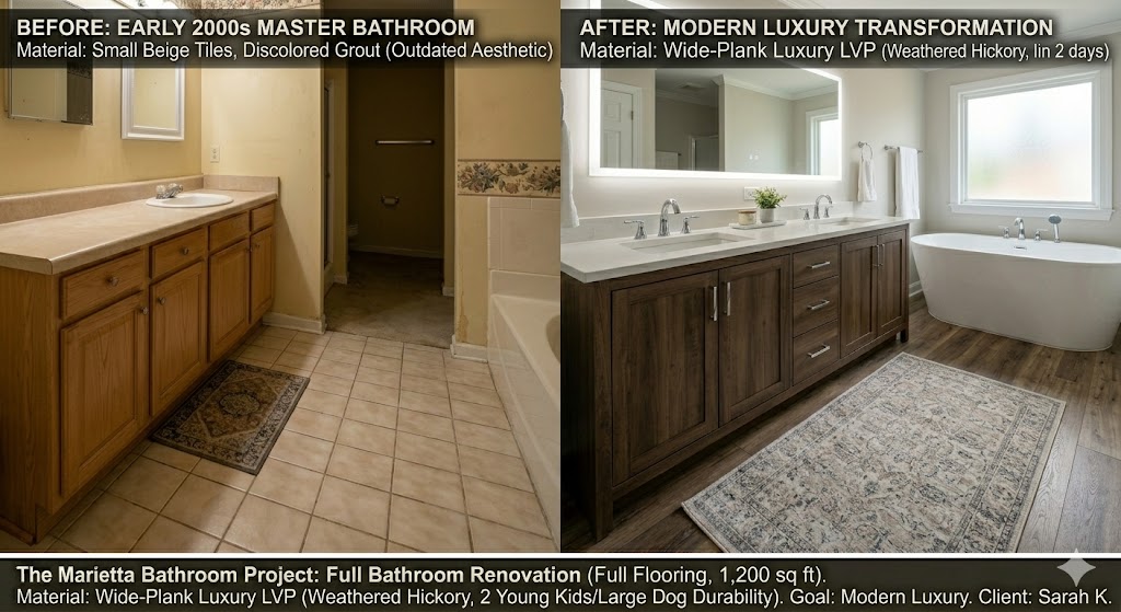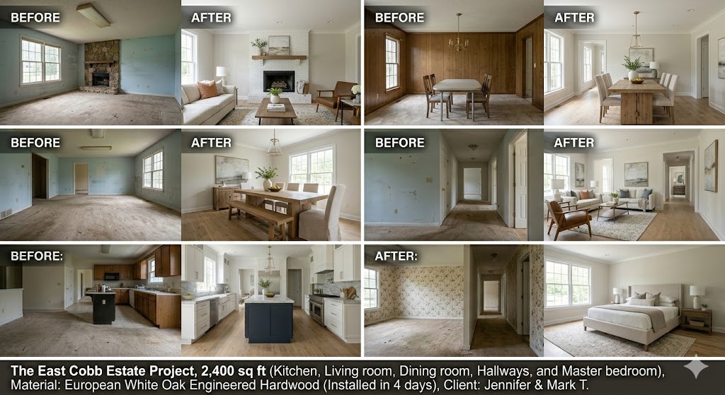 Below, you'll find real before-and-after transformations from homes across Marietta, East Cobb, Roswell, and surrounding communities. These aren't staged model homes — they're real spaces, lived in by real families, transformed by the Carpet Uno team. Every project was completed on time, on budget, and to our exacting standards.