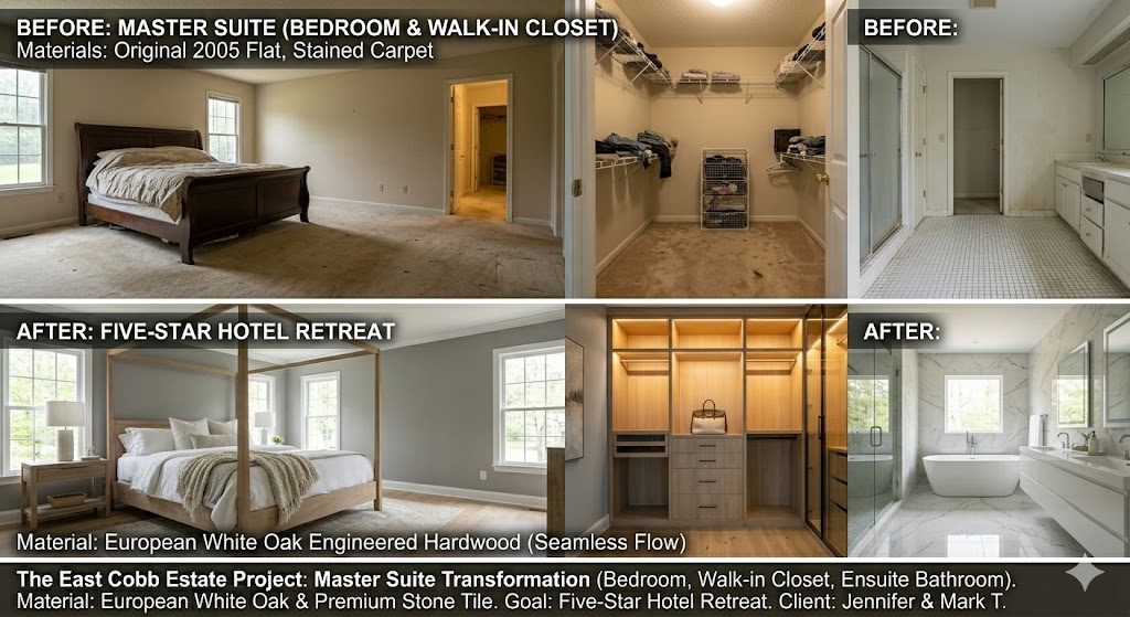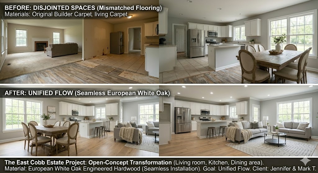This East Cobb family had lived with builder-grade carpet and outdated tile for over 12 years. They wanted a cohesive, luxury look throughout their main level and master suite — something that matched the home they'd worked so hard to build.
