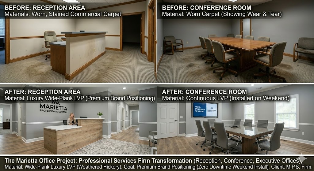 This Marietta professional services firm needed a flooring upgrade that reflected their brand's premium positioning. The existing commercial carpet was worn, stained, and dated. But with a busy Monday–Friday operation, they couldn't afford downtime.